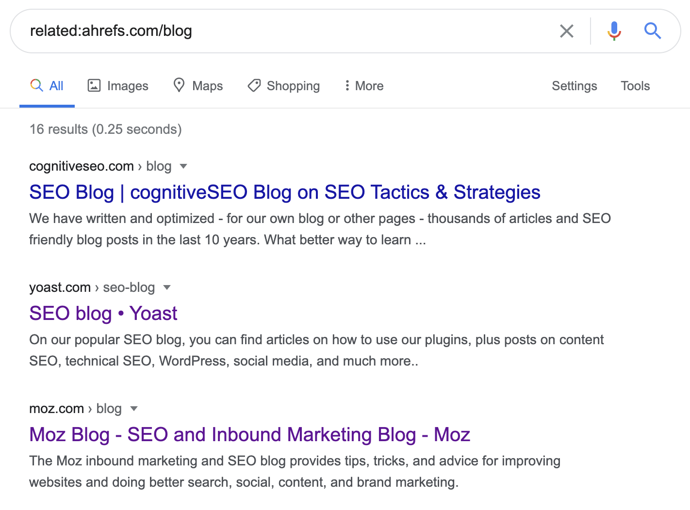 توجه داشته باشید که این روش ممکن است کمی مورد استفاده قرار گیرد. اگر سایت شما کاملاً جدید است و هنوز برای بسیاری از کلمات کلیدی رتبه بندی نکرده است، ممکن است فقط چند نتیجه جستجو ببینید. در هر صورت، قبل از رفتن به مرحله بعد، مطمئن شوید که سایت ها را به صورت دستی بررسی کنید. اگر شبیه رقبا نیستند، آنها را نادیده بگیرید.