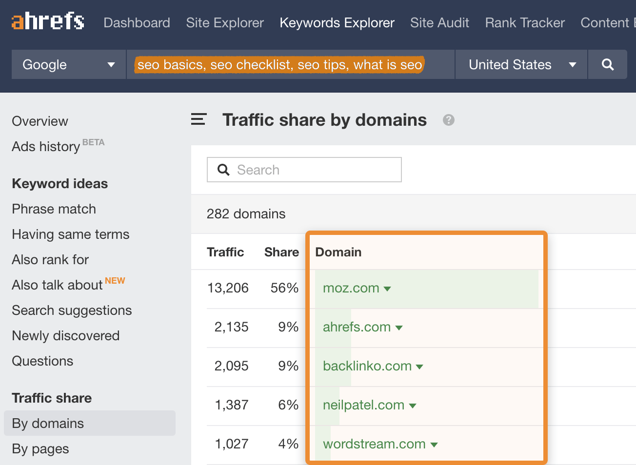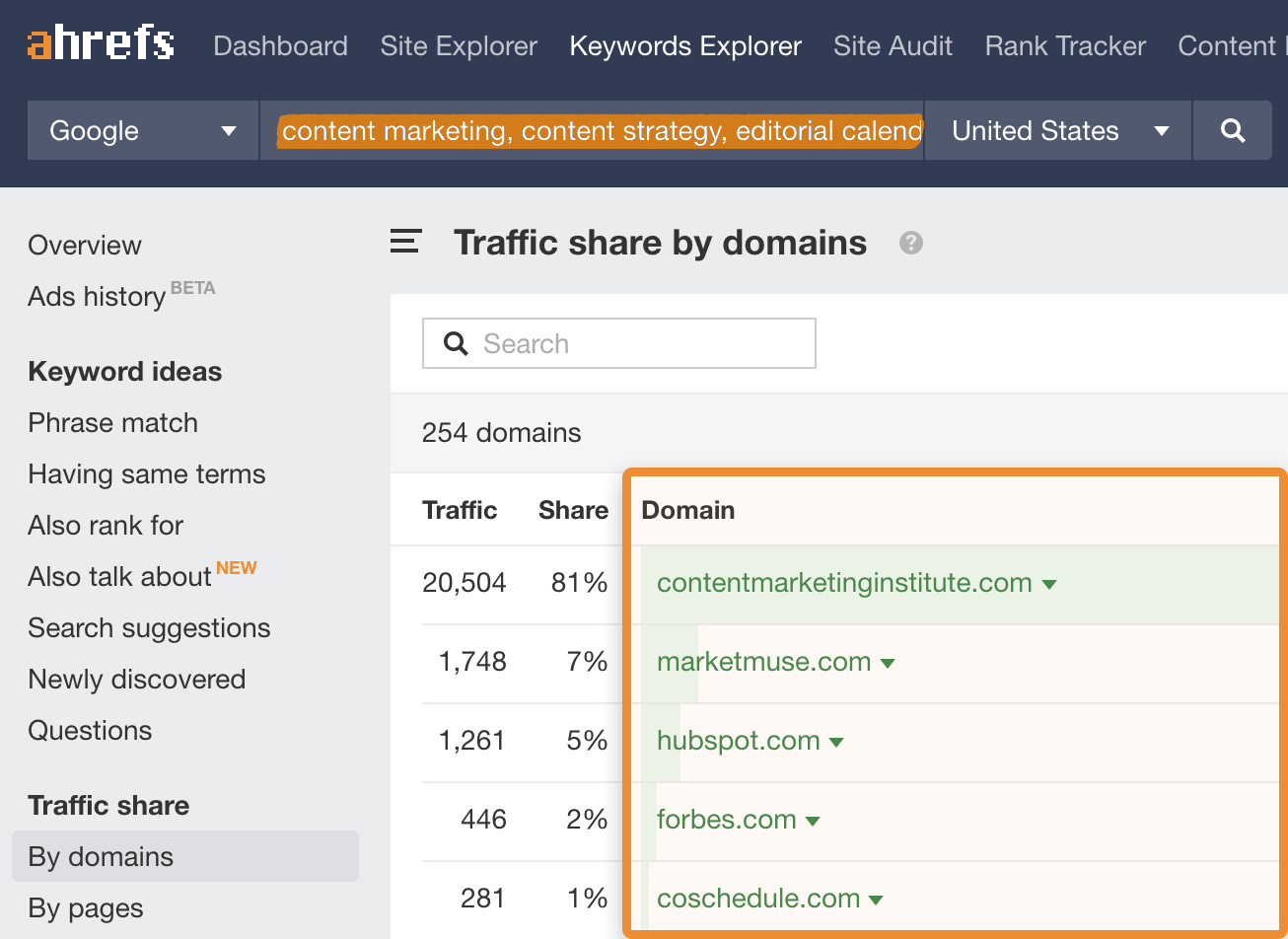 اگر هیچ یک از روشهای بالا نتایج مرتبطی را ارائه نکرد، یک چند کلمه کلیدی مرتبط و ارزشمند در Keywords Explorer Ahrefs و گزارش Traffic Share by Domains را بررسی کنید. این وبسایتهایی را پیدا میکند که بیشترین ترافیک ارگانیک تخمینی را از کلمات کلیدی جستجو شده دارند.