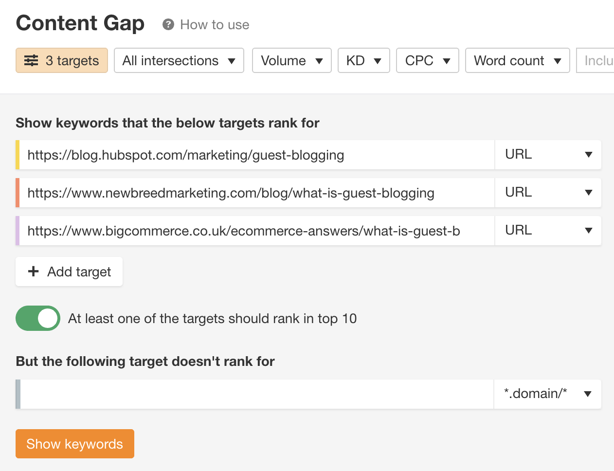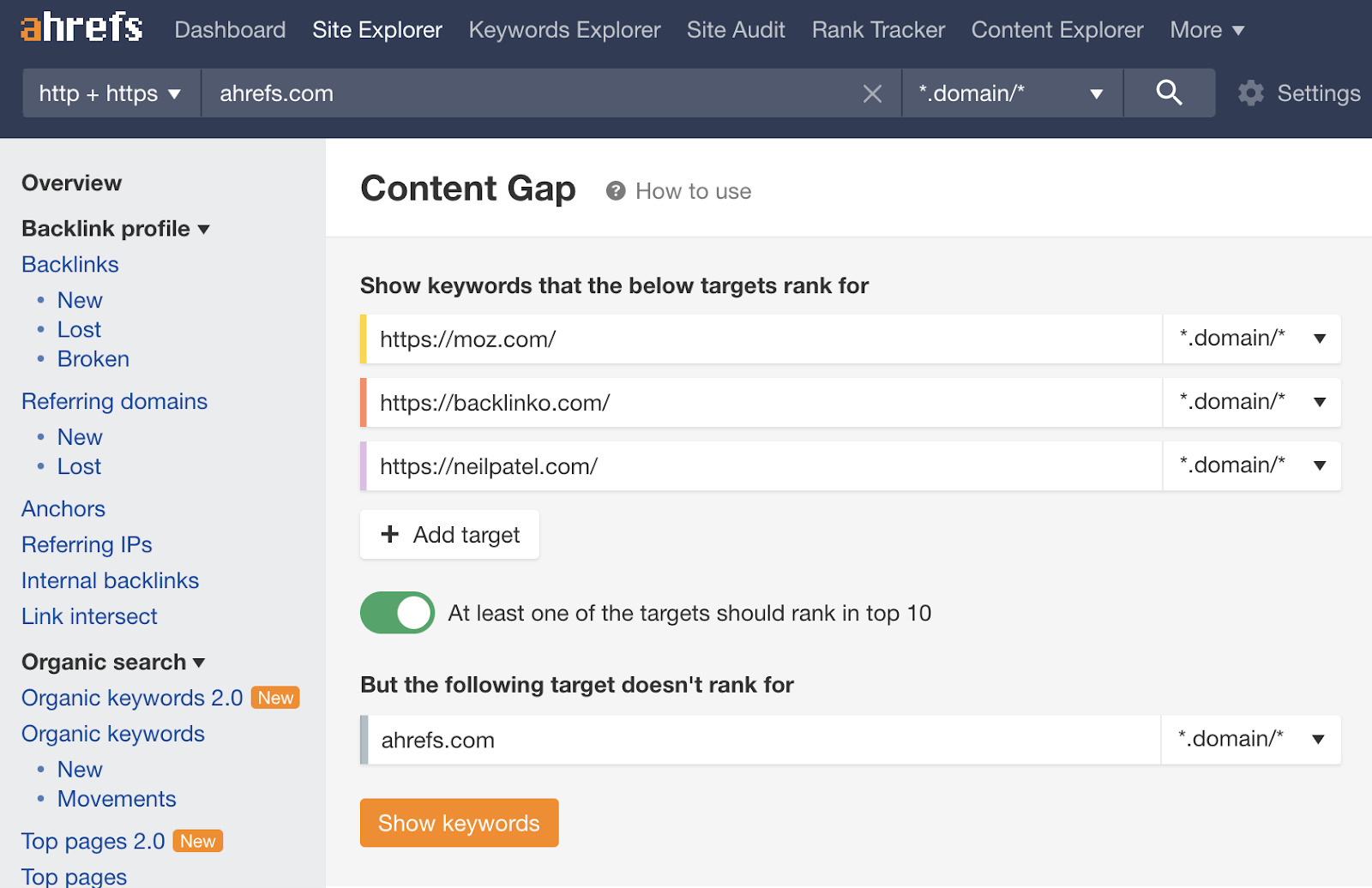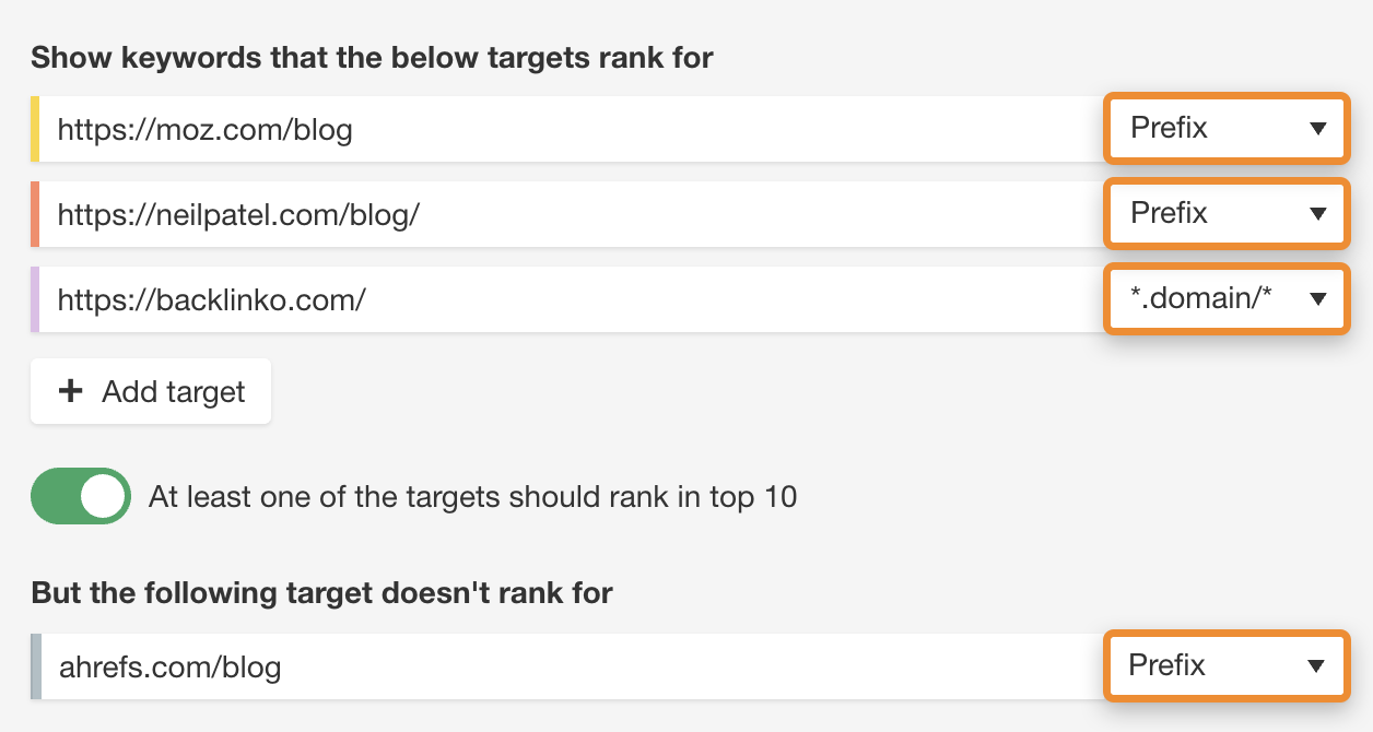 اگر می خواهید فقط کلمات کلیدی را ببینید که رقبا در بخش خاصی از وب سایت خود رتبه بندی می کنند، به جای آن یک زیر دامنه یا زیرپوشه وارد کنید. به عنوان مثال، اگر ما در حال اجرای تجزیه و تحلیل رقابت کلمات کلیدی برای وبلاگ Ahrefs بودیم، ممکن است رقبایی مانند Backlinko و Moz را وارد کنیم. اما از آنجایی که ما فقط به محتوای وبلاگ علاقه مندیم، می خواهیم به جای moz.com، moz.com/blog را تجزیه و تحلیل کنیم، زیرا همه URL های پست وبلاگ آنها شامل این پیشوند است.