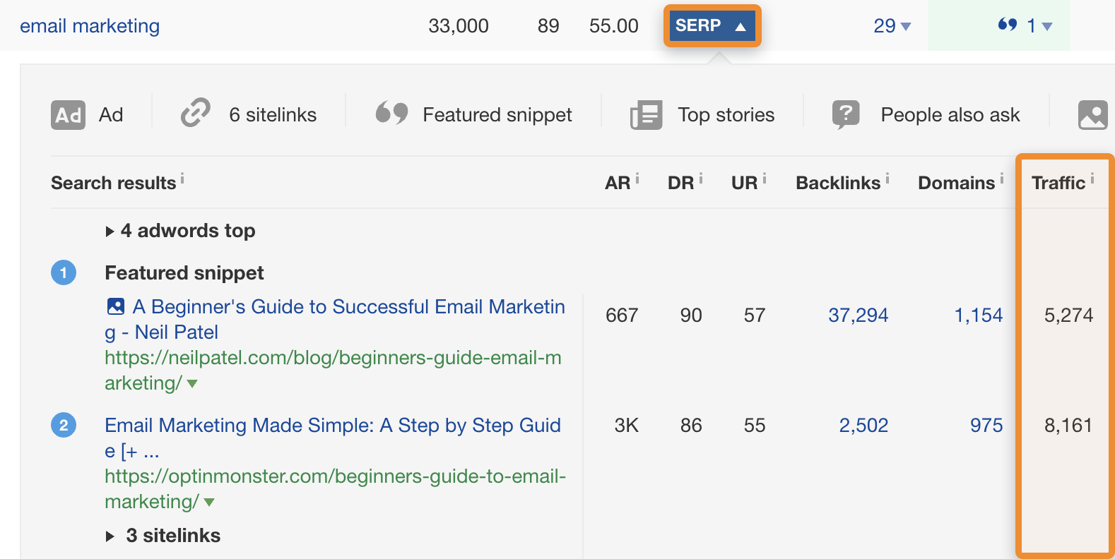 نگاه کردن به ترافیک صفحات با رتبه برتر، روشی بسیار مطمئنتر برای قضاوت در مورد پتانسیل ترافیک یک کلمه کلیدی نسبت به حجم جستجو است. توصیه میکنیم همیشه قبل از تصمیمگیری نهایی در مورد دنبال کردن کلمه کلیدی، این موضوع را بررسی کنید.