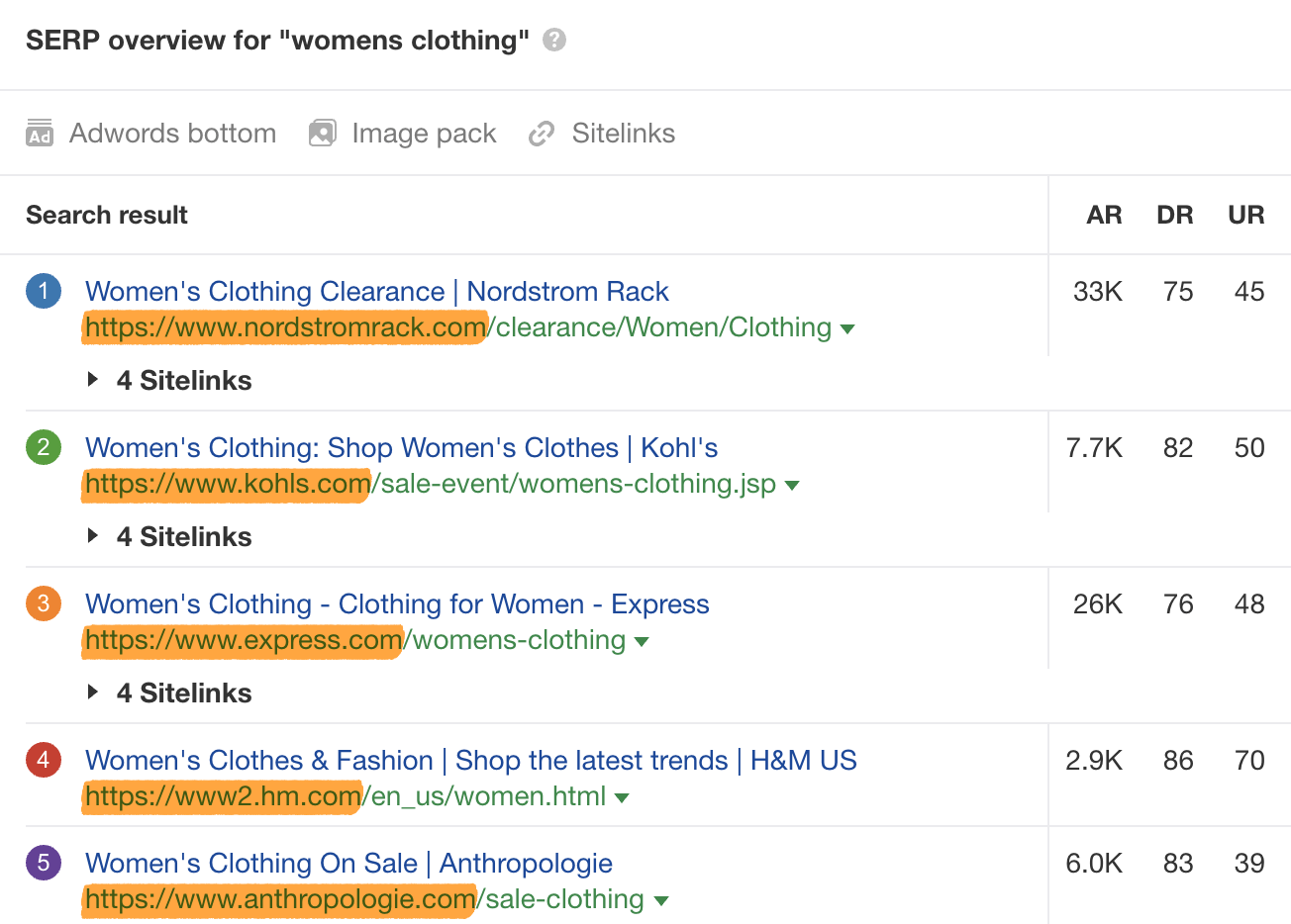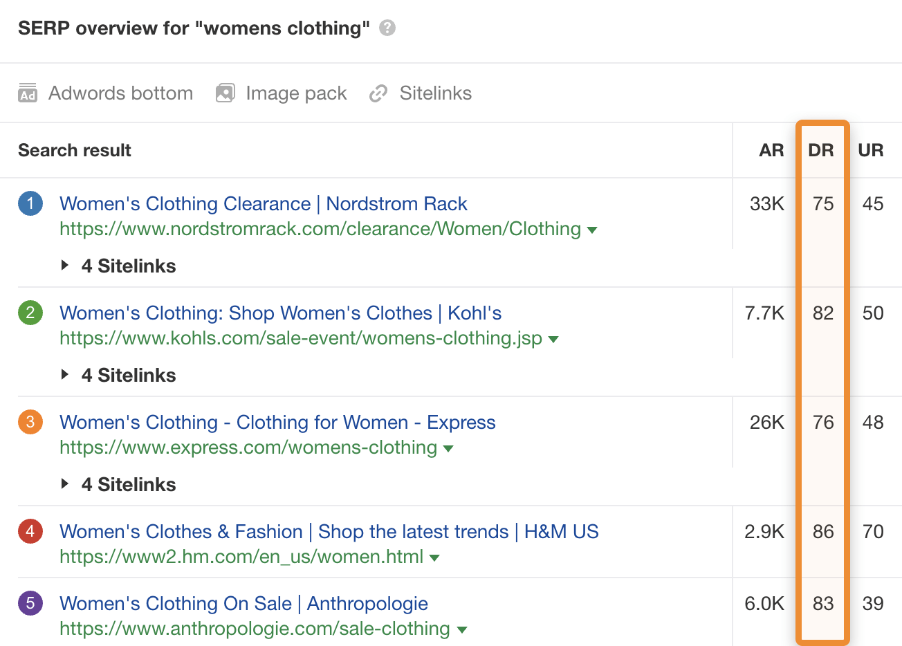 شما می توانید DR همه سایت های با رتبه برتر را در نمای کلی SERP ببینید.