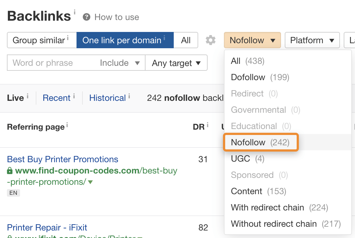 در ابتدا شکستن کلمه کلیدی بسیار سخت به نظر می رسد زیرا صفحه با رتبه برتر دارای پیوندهایی از وب سایت های زیادی است. اما اگر پیوندهای برگشتی آن را در Site Explorer، اکثر آنها با کیفیت پایین و nofollow هستند.